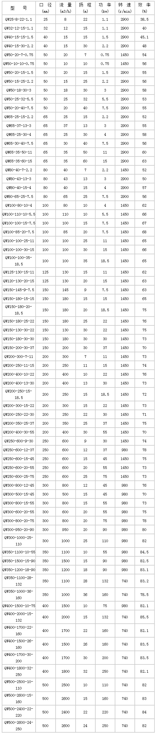 WQP型不鏽鋼無(wú)堵塞潛水泵性(xing)能參數: