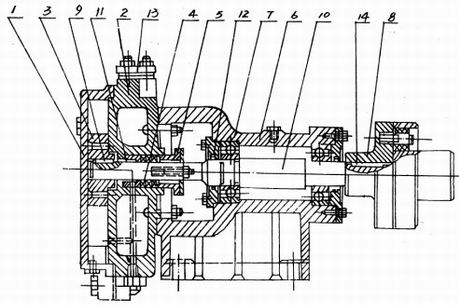 8. 聯軸器 9.葉輪(lun)平健 10.泵軸 11.填(tián)料環 12.軸承壓(yā)蓋 13.法蘭盤 14.聯(lián)軸器平健